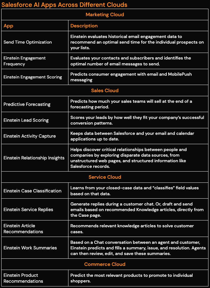AI in Salesforce is an emerging technology, with numerous new functionalities continually being released. Recently, much of the excitement has centered around Predictive and Generative AI. Predictive AI involves utilizing relevant data to train a model, which is then used to generate predictive insights and metrics. These insights can assist in making more informed decisions when planning campaigns and setting up marketing targets. Examples of Predictive AI in Salesforce include Einstein Engagement Scoring and Predictive Forecasting (see the table below for a description).
