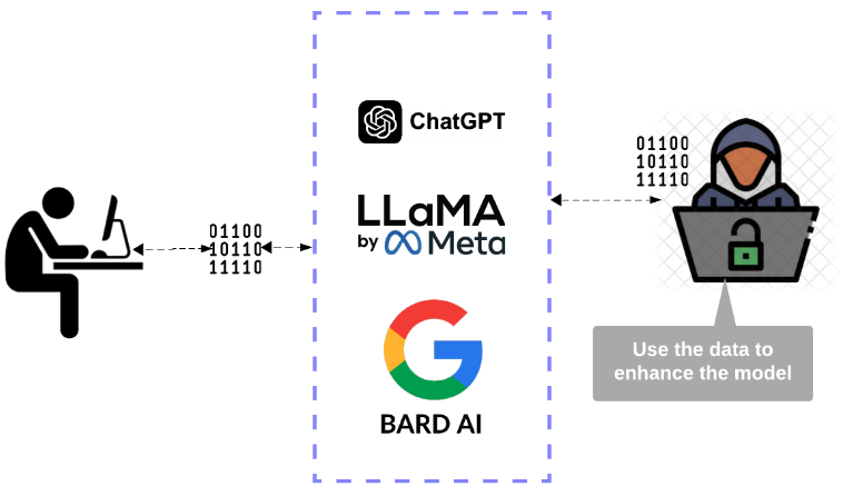 Data security and integrity are major risks identified in the adoption of AI systems by organizations. The figure below illustrates the potential risk of using publicly available AI tools for business-related purposes, where prompts provided by users are used to train the models which could lead to data breaches. With Einstein Trust Layer, a secure AI architecture, users can be assured of data security and integrity. The layer provides warnings about biased generative AI responses and records every AI interaction for record-keeping, compliance, and auditing. The trust layer also offers features like customer-configured data masking and provides enhanced control over data privacy.