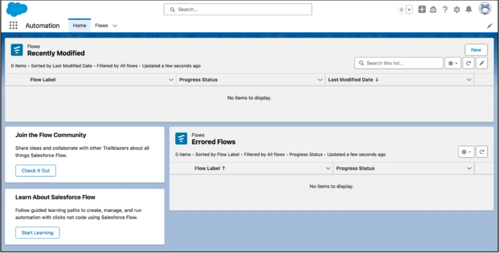 The Automation Lightning App has been created to be the home for all things automation-related. Users with access to the app can see flows, errors, and other community-based links within the main application.